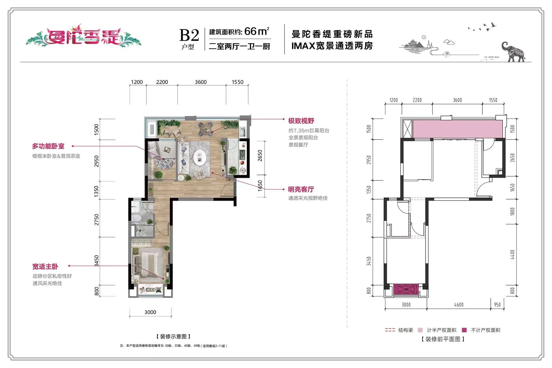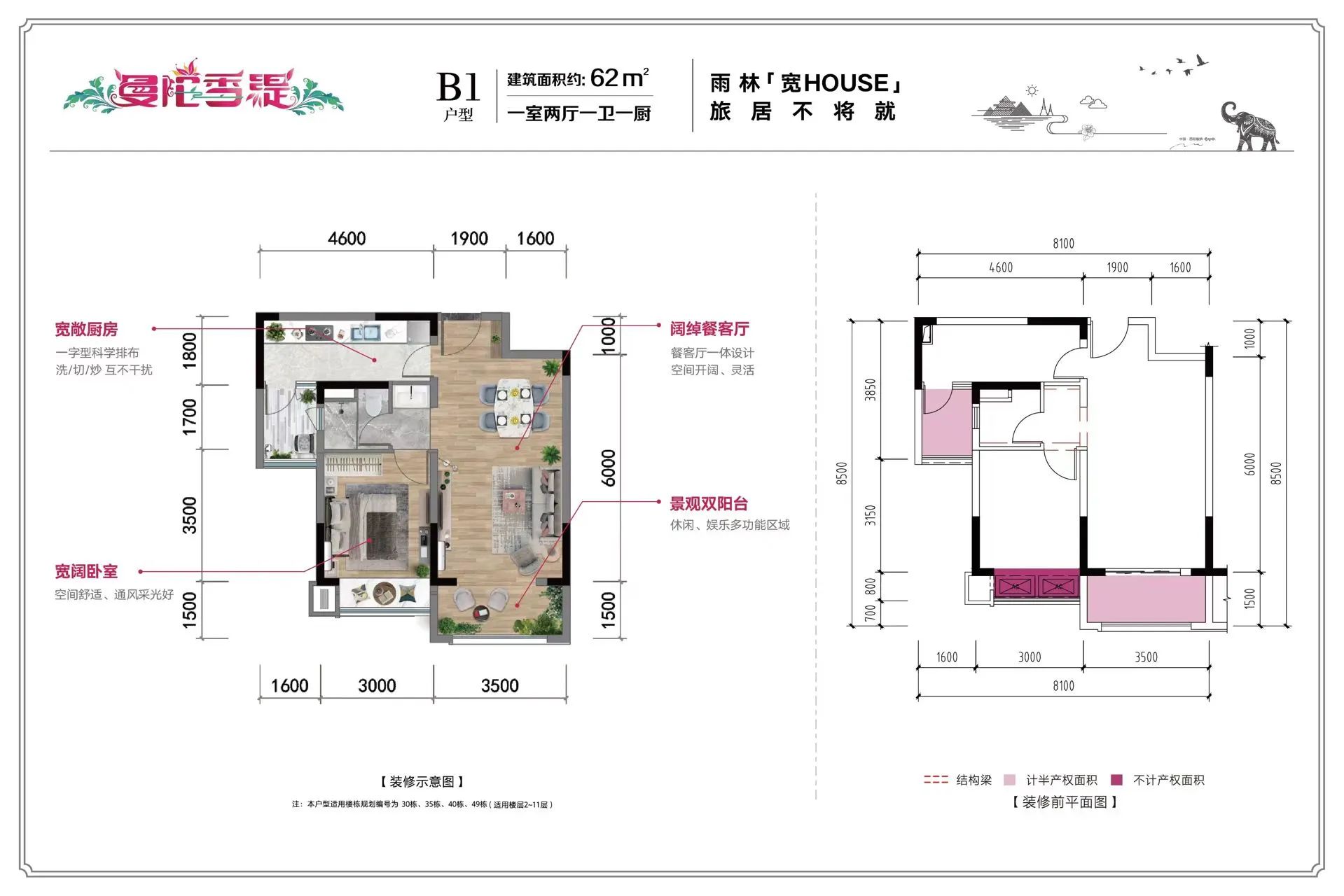 户型面积:62平一房一厅,66平两房一厅
