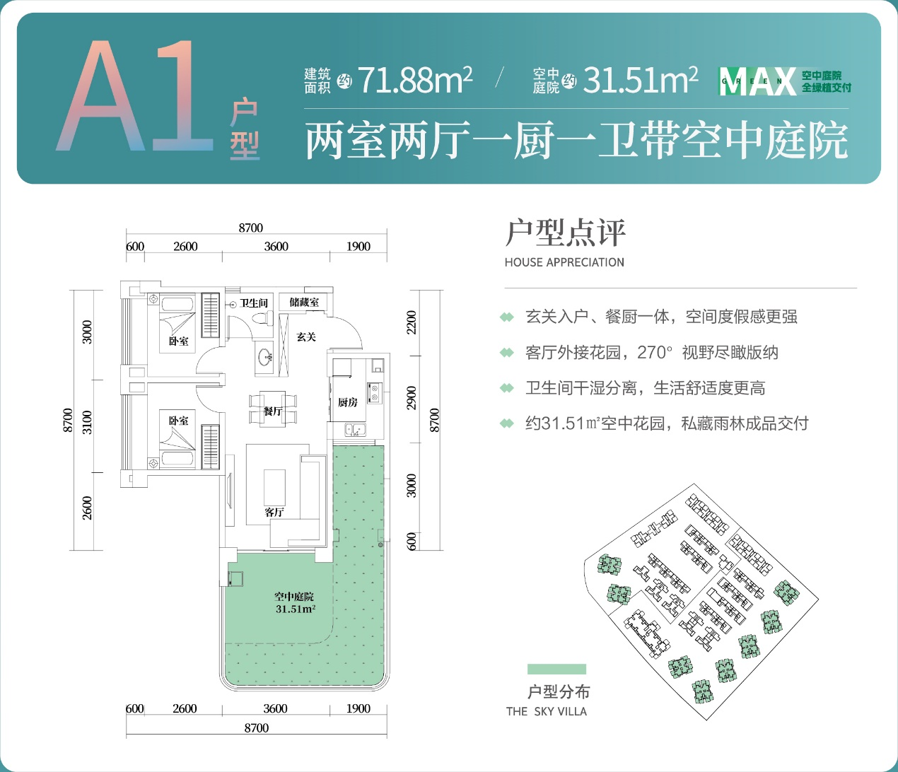 空中花园6米层高,让植物随心所欲生长;270°视野,雨林风光尽收眼底;买一半、送一半,实得面积约100%。